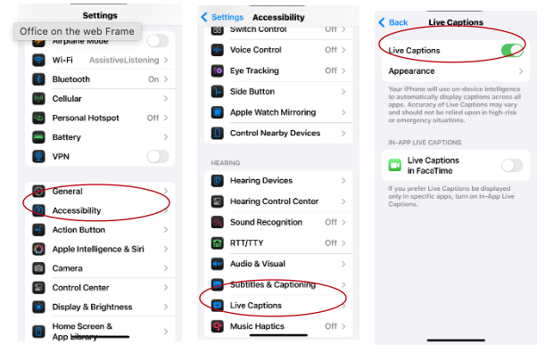 Turning on Live Captioning on iOS: Live Captioning for iOS is set through the Settings menu. Live Captions is available in English (U.S. and Canada) on iPhone 11 and later. The device must also be on iOS 16 or later.