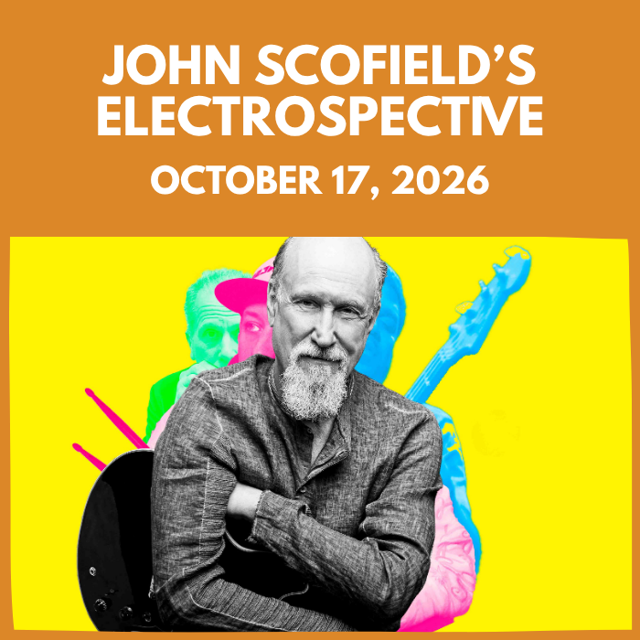 Through his 54-year career, 3-time Grammy Award winner John Scofield has occasionally detoured from the traditions of straight-ahead jazz, exploring a blend of funk and jazz that has led to some of his most popular projects. In late autumn of 2026, Scofield looks back at many of his now classic fusion groove compositions with Electrospective. Not intending to replicate the earlier fan favorites, he plans instead to revisit them with the seasoned perspective of several decades; culling tunes from his Blue Matter, Uberjam, and AGoGo bands – each responsible for a few recordings – as well as new material in the same vein. Scofield looks forward to teaming up with a stellar band of colleagues, Electrospective will rely on interpretative input from Scofield alum and super funk drummer/producer Adam Deitch (Lettuce), multidimensional Larry Goldings (Scary Goldings, James Taylor) on keyboards, and legendary bassist Oteil Burbridge (Dead & CO., Tedeschi Trucks, Allman Brothers). With this repertoire so frequently (and loudly) requested by audience members, Scofield is glad to have a band that will truly do the music justice.